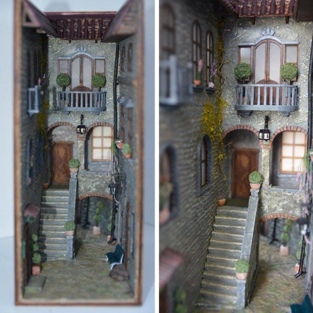 It’s incredible to see the handiwork that goes into creating a single book nook. Many makers meticulously craft elements like lamp posts, signage, and even fire escapes that boast a life-like look and feel—in a photo, it’s only upon seeing them on a shelf that you realize the landscape is a book nook. These pieces also include lighting to add to the wonder that these small sculptures evoke. The fairy lights call you from across the room and invite you to get lost in these magical places.