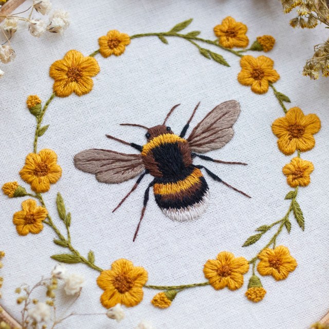 Since she first began embroidering in 2013, Emillie Ferris (previously) has stitched a few rows nearly every day. The United Kingdom-based artist creates dense thread paintings of butterflies, bees, and other creatures surrounded by vibrant, scattered florals. Her lengthy stitches form precisely colored patterns and rows, offering a distinct texture to each wing and antennae.