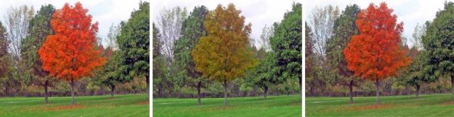 These images illustrate the effect a metasurface-based contact lens would have on a person with deuteranomaly. The left image shows the original scenario while the middle image is how the scene would look to a person with deuteranomaly. The image on the right represents the scene viewed with deuteranomaly and corrected with the new contact lenses. Credit: Sharon Karepov, Tel Aviv University