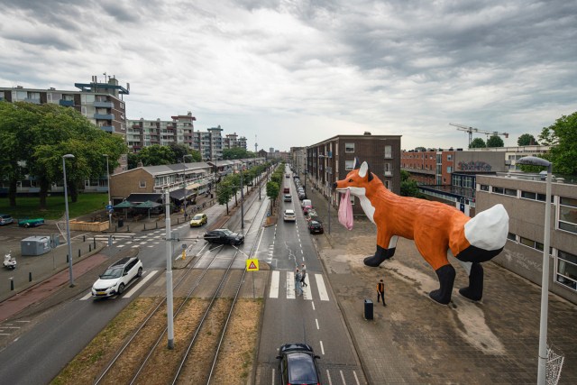 Residents of Rotterdam’s Bospolder-Tussendijken frequently spot bushy-tailed foxes roaming their streets at night, but now, Dutch artist Florentijn Hofman has given the carnivorous animal a permanent home in the area. He recently installed a massive “Bospolder Fox” that peers over a busy intersection in the neighborhood. Spanning 16 meters, the fox holds a pink bag in its mouth, a gesture that anthropomorphizes the wild animal, as Hofman asks, “Has the Bospolder Fox stolen something? Is he clearing up litter? Or has he just returned from a shopping spree on the market?”