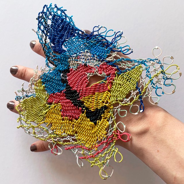 United Kingdom-based designer Alexandra Sipa creates spellbinding accessories and garments from waste electrical wires. The Central Saint Martins’ graduate initially was inspired to experiment with wires as textiles when her headphones broke, leading her to extract the colorful coils and cables to create wire lace.