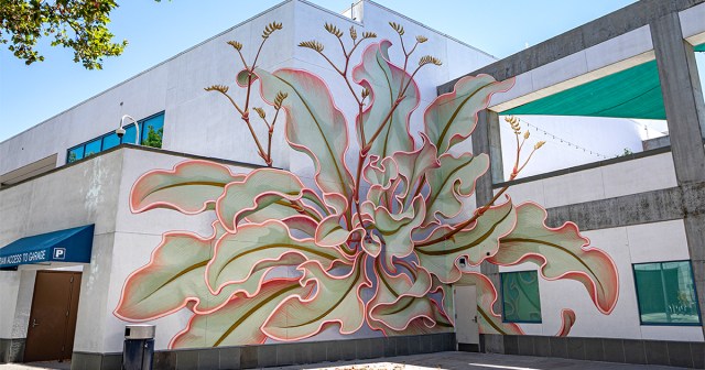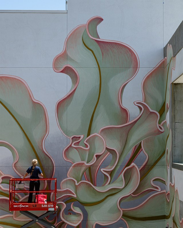 An enormous flower overtakes the San José’s cultural affairs building in a multi-plane mural by artist Mona Caron (previously). Titled “Limonium,” the delicate, pink-and-green leaves spread out across the structure’s facade, transcending a single side. Wrapped around six walls and across four planes, the flower appears to be growing continuously from multiple angles.