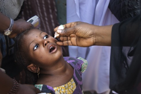 Girl receives polio vaccine in Kaduna, northern Nigeria city, during polio national immunization days (NIDs). During NIDs teams of vaccinators try to reach every child in Nigeria. Kaduna, Nigeria
