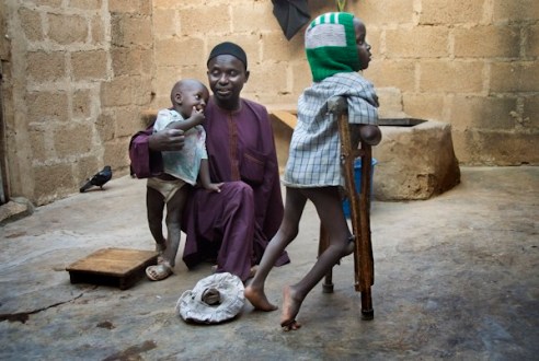 Aminu Ahmed Tudun-Wada, chairman of KPVTA, with two of his children at his home in Kano. Umar (R) is his only child affected by polio. Umar was born in 2003 when immunization was boycotted in the State of Kano and its surroundings; he contracted polio few months after his birth. Kano, Nigeria