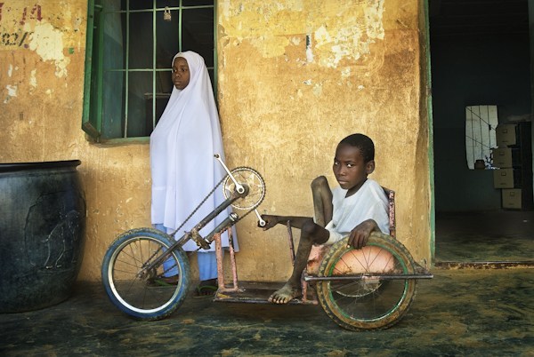 Polio victims Naja Atu Yusif (L) and Adamu Yusif (R), in the courtyard of their primary school in Kano. While Naja can limp, Adamu can’t walk and has to use a tricycle to move around. Kano, Nigeria