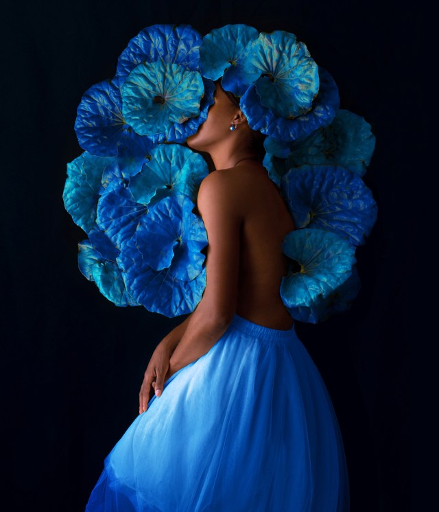 Surrounded by monarchs or a blanket of blue leaves, Fares Micue (previously) captures vividly composed self-portraits. The Spain-based photographer conceals her face and instead focuses on the organic elements surrounding her torso. Whether a series of origami birds or yellow and red twigs resembling flames, the natural additions merge seamlessly with Micue, who bends and contorts her figure to follow the shapely forms of the arranged objects.