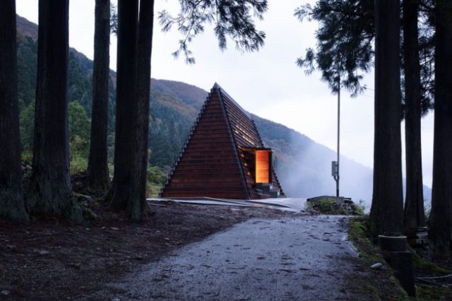 Nestled deep in the Gokayama mountains of Japan is Marebito no ie, a wooden cabin constructed near Toga village. The region is renowned for a unique type of A-frame housing design and architectural style known as gasshō-zukuri (合掌造り) which uses wooden beams combined to form a steep roof that can easily shed snow from their roofs. Marebito no ie was designed as a contemporary homage to this tradition but with minimal impact to the environment: an affordable Shopbot 3D wood cutter was brought in and the entire project was completed with local timber that did not have to be transported.