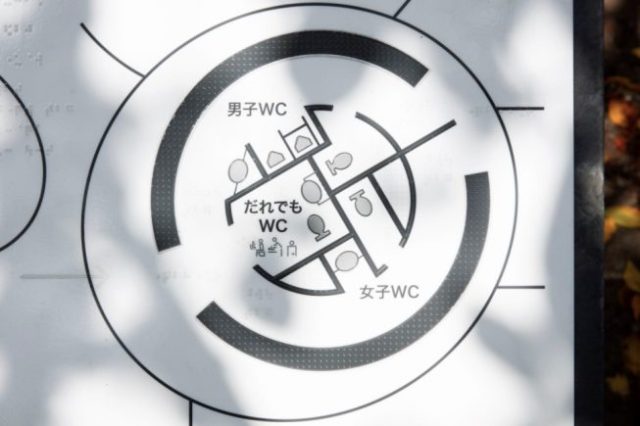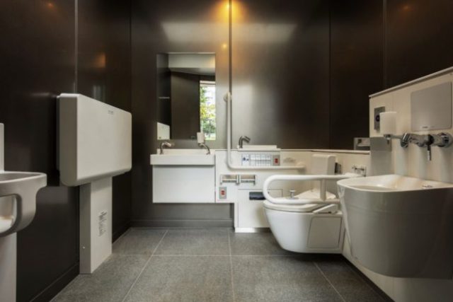 inside “everyone’s toilet,” which is equipped with ostomate facilities, baby chair, and diaper changing table