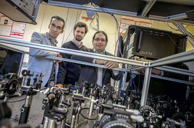 Eden Figueroa (right) has worked for several years on technology that would extend the distance that quantum particles can travel and still be entangled. Here Figueroa and researchers Mehdi Namazi (left) and Mael Flament (center), part of his team at Stony Brook University back in 2018, stand behind one prototype of technology that’s impervious to hacking. (Credit: Stony Brook University)