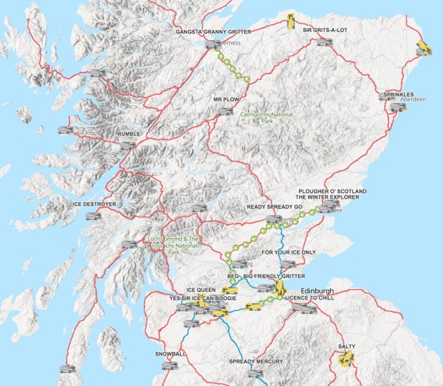This is a map showing the real-time location of Scotland’s fleet of snow plows (which they call “road gritters”). As Jackie Sojico discovered, Scotland names their plows and some of them are hilarious.