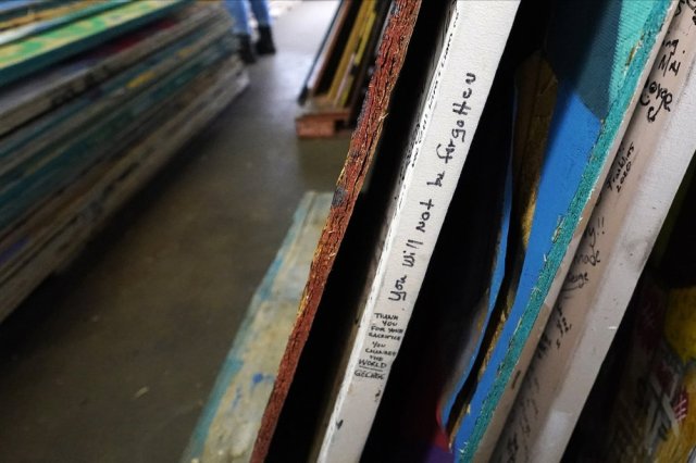 Plywood mural boards are lined up at a warehouse, Saturday, Dec. 12, 2020, in Minneapolis ready for volunteers to help organize them. Leesa Kelly, left background, and Kenda Zellner-Smith, right in yellow, formed the Save the Boards to Memorialize the Movement to preserve the painted expressions and pain born of outrage after the death of George Floyd at the hands of Minneapolis police in May. (AP Photo/Jim Mone)