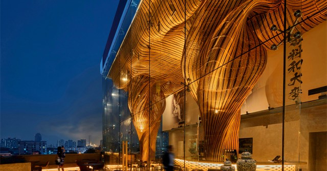 The rattan devotees over at Enter Projects Asia are back with a sweeping installation that swells through a Bangkok restaurant overlooking the Chao Priya River. Occupying the lounge of Spice & Barley, two 30-meter pillars ascend from the ground level before erupting into a mass of black-and-gold stripes.