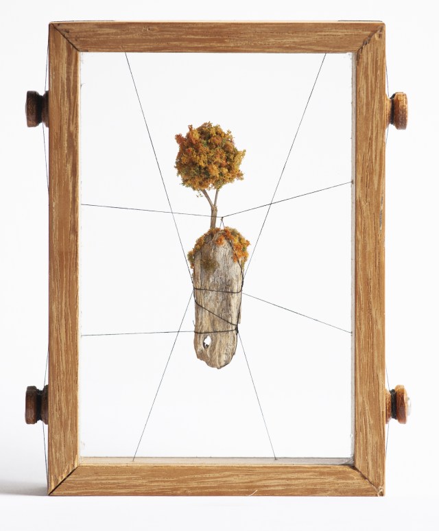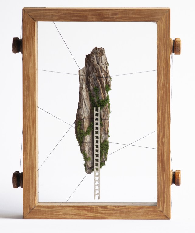 Suspended within Rosa de Jong’s simple wooden frames are miniature dwellings that climb the steep, rocky terrain. Stilt houses, tents, and exceptionally tall ladders form the idyllic environments that are surrounded by faux moss, minuscule trees, and generally rugged typography.[…]