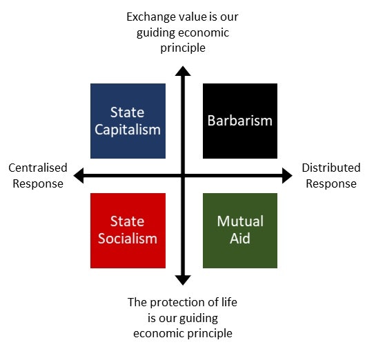 From an economic perspective, there are four possible futures: a descent into barbarism, a robust state capitalism, a radical state socialism, and a transformation into a big society built on mutual aid. Versions of all of these futures are perfectly possible, if not equally desirable.[…]