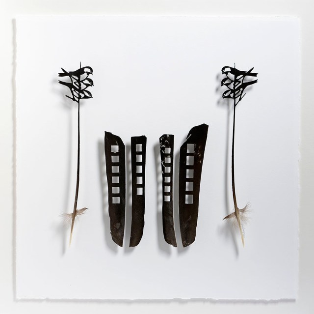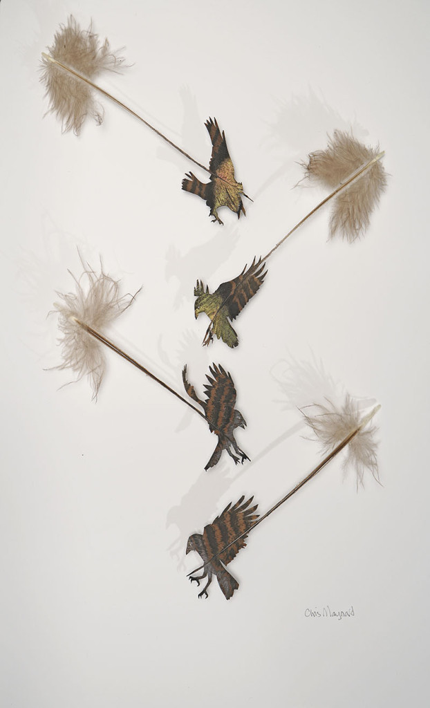 Chris Maynard developed a method of backing feathers with pressure, glues, and papers so the feathers can be carved and still retain their stability. What the viewer sees is the natural feather. He uses naturally shed feathers which mean that a bird that donated a feather is likely still alive. They are pinned above the white background about 1/2 inch (1cm) so shadows become prominent in the final works.
