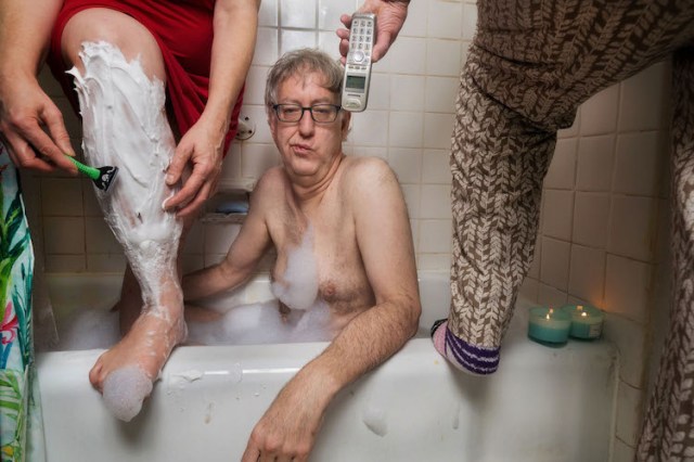 Living in a small New York City apartment has its share of logistical challenges when snapping photographs. The space is dark which requires Kramer to use speed lights and a wide-angle lens in order to get everyone in the frame. And then there’s the actual shooting of the image. “Sometimes, the behind-the-scenes was more dramatic than the actual results,” he shares. “One of the most popular photos involved me in a bathtub while my mother and ex-wife interrupted me. We laugh now that it became a popular photo because the shooting of it was the worst experience. We were trapped in a tiny bathroom along with a tripod in front of us, a light stand in the corner, the laptop sitting precariously on the toilet, and my mother freaking out that the light would fall into the bathtub filled with water and electrocute us. We took maybe four shots and then called it a day.”