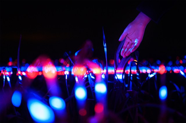Spread across a thick field of leeks in the Netherlands is Daan Roosegaarde’s new installation that illuminates the practice of modern farming, highlighting the plants that feed us and their plights. In “Grow,” the Dutch artist and designer, who’s known for glowing, interactive exhibits, implanted the rows with red, blue, and ultraviolet lights that shine vertically across the crop and shift in entrancing motion.