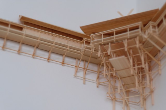 Architect Naohiko Shimoda’s interpretation of a kamidana—a small altar or “god shelf” that’s part of a tradition to bring Shinto shrines into private spaces—strays from the simple ledges most often found in Japanese homes. Designed with an intricate foundation and slatted roof, the wooden structure lines an inner corner and is installed high on the wall following the custom. The precise and detailed construction is built on a 1:1 scale, allowing it to “be regarded as architecture with unique proportions and beauty.”