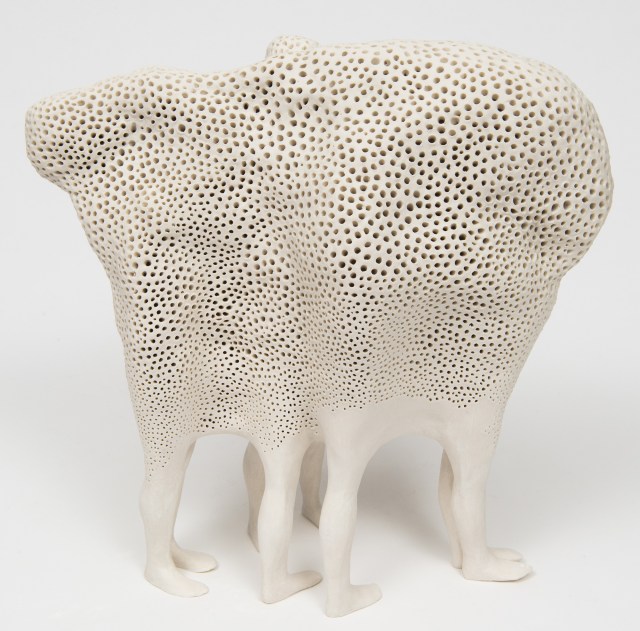 Argentina-born artist Claudia Fontes (previously) continues her Foreigners series with small sculptures of figures enveloped by plumes of porcelain. Recent additions to the expanding collection are more abstract than previous iterations, which often revealed the body’s curves and gestures, although all of the works feature limbs embracing within or attempting to escape from the textured clouds. The pocked surface resembles organic matter, like sea sponges or coral, and seamlessly merges life forms into a cohesive structure.