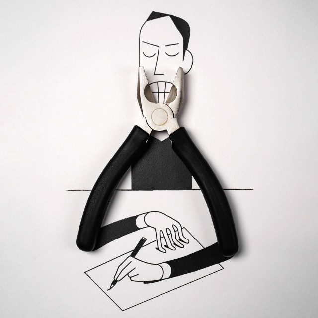 For Christoph Niemann (previously), all it takes is a halved apple or pliers lying around his studio to spur a quirky drawing featuring the random object. The illustrator is known for his Sunday Sketches, a weekly drawing series, that play with scale and position. Imbued with humor, the cleverly arranged compositions turn a red pencil into a megaphone or a splayed book into a cat’s whiskers.