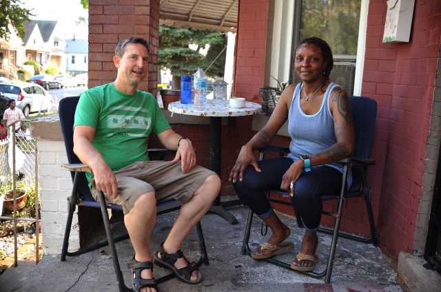 Nanette, an Englewood resident, sits on and Wade’s porch in Edgewater.