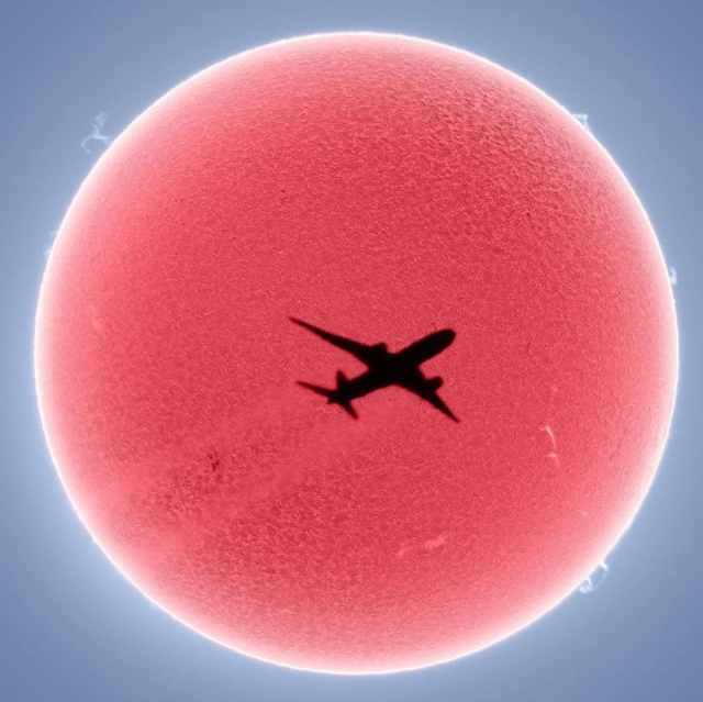 Although this photo seems like the work of careful planning, it was snapped entirely by accident. “I had set up my solar telescope to capture an image of the full disc of the sun,” McCarthy explains to My Modern Met, “and since taking pictures involves using a high-frame-rate camera, I was in the middle of a batch of frames when the plane crossed, allowing me to capture that perfect moment when it was dead center! It was sheer luck.”