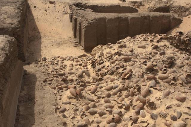 Detail of the deposit of beer jars in front of the east corner gateway of the enclosure of King Peribsen (ca. 2800 BCE).