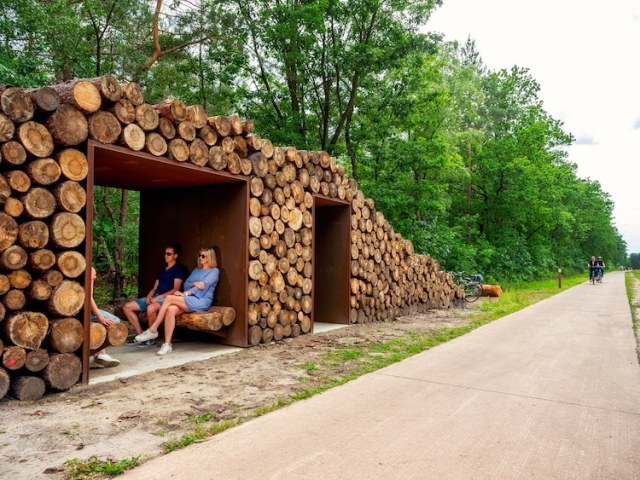 “The trees were of course very important,” saiys Pieter Daenen, founder of BuroLandschap. “After all, cycling through the trees would no longer make sense if trees were damaged or destroyed after the construction of the structure.” The circular form of the path helped preserve this environmental intention behind the design. A crane was built at the center of the circle and helped to build up the structure while being minimally invasive to the trees and surrounding plant life. Though some trees had to be cut down or trimmed to make room for the route, they were reused to create interesting shelters near the main circular path.[…]