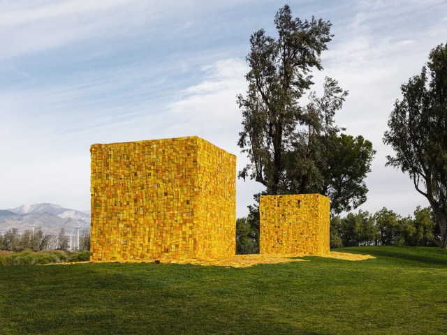 A mottled patchwork of plastic cloaks two cubes that tower over the desert landscape of Coachella Valley. Titled “The Wishing Well,” the bright pair are the work of Ghanaian artist Serge Attukwei Clottey, who created the nine-foot pieces from scraps of Kufuor gallons, or jerrycans, in response to shared struggles with water insecurity that ripple across the world. Resembling a yellow brick road, a paved walkway connects the two woven structures that stand in contrast to the surrounding environment, which faces continual struggles with access to the natural resource.