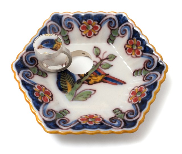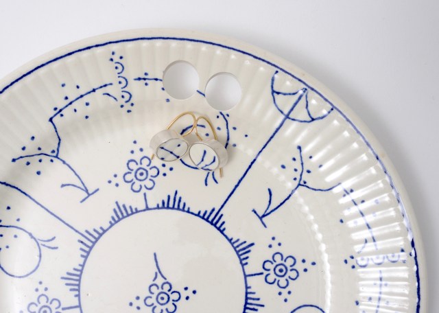From her studio in Amsterdam, Gésine Hackenberg (previously) punches perfectly round discs from Delftware and antique ceramic dishes. The ornate, pearl-like forms are then strung together into necklaces or secured into metal bands for rings and earrings. Juxtaposing the old and new, the completed wearables are positioned alongside the original dinnerware to draw connections between the domestic objects and personal adornments that are ubiquitous in everyday life.