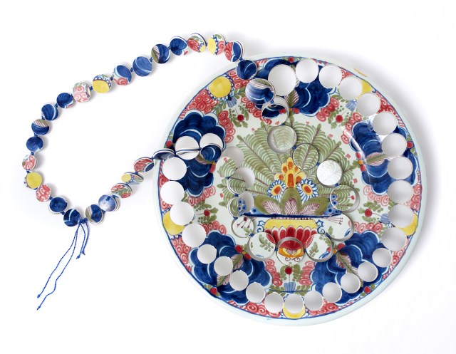 From her studio in Amsterdam, Gésine Hackenberg (previously) punches perfectly round discs from Delftware and antique ceramic dishes. The ornate, pearl-like forms are then strung together into necklaces or secured into metal bands for rings and earrings. Juxtaposing the old and new, the completed wearables are positioned alongside the original dinnerware to draw connections between the domestic objects and personal adornments that are ubiquitous in everyday life.
