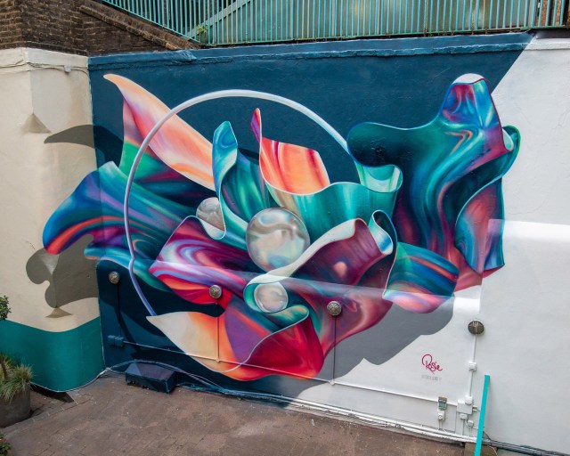 As if lifted by a breeze, oversized ribbons and bunches of fabric float across the trompe l’oeil murals by London-based artist Rosie Woods. The gleaming, prismatic textiles sway and subtly twist into folds and ripples in the spray-painted works. Through the flowing movements, Woods explores the fluid, ever-changing nature of the human experience by synthesizing abstraction and realism. She explains:
