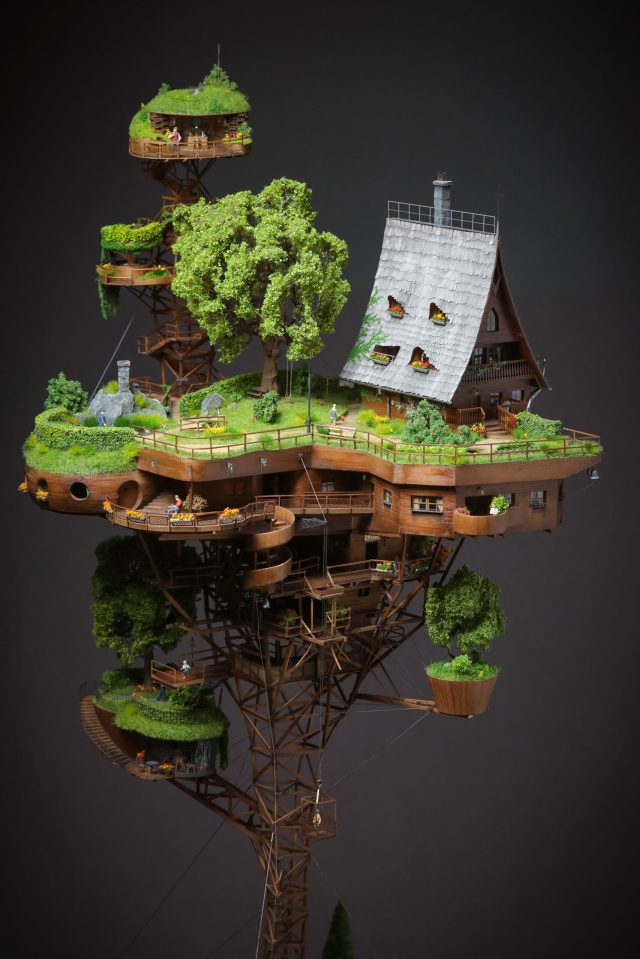 Bulgarian artist Ognyan Stefanov pairs his day job as an aviation photographer with an equally lofty practice of crafting lavish architectural miniatures that soar high in the air. One of his creations is this utopic village, aptly named “Skyville,” which was designed as a self-sustaining enclave complete with shops, farms and gardens, a library, and a few homes, including the main house with the individually tiled pitched roof. Posted atop a latticed tower, the heavily landscaped town was designed to mimic real functionality with a water drainage system, pulleys, and walkways that climb from level to level.