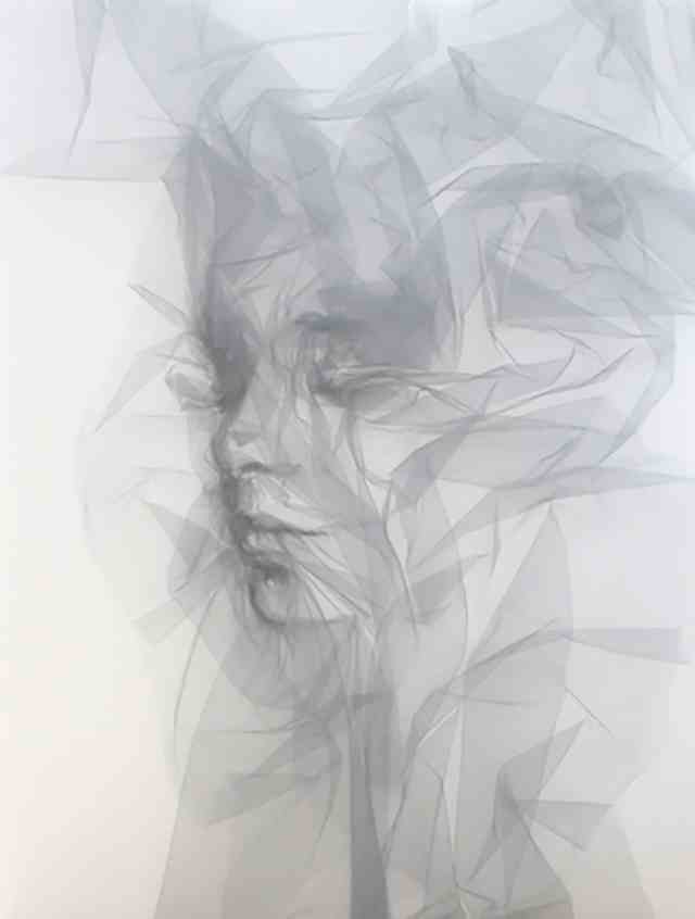 Since he began experimenting with tulle over a decade ago, multidisciplinary artist Benjamin Shine has become most well known for his work with the unconventional medium. He uses the versatile mesh material to fashion striking artworks that range anywhere from abstract works on canvas to meticulously crafted sculptures and ethereal installations. In his ongoing Flow series, the artist depicts anonymous, abstracted faces whose delicate features are formed in bunches of finely netted tulle fabric that appear to float in thin air like smoke.
