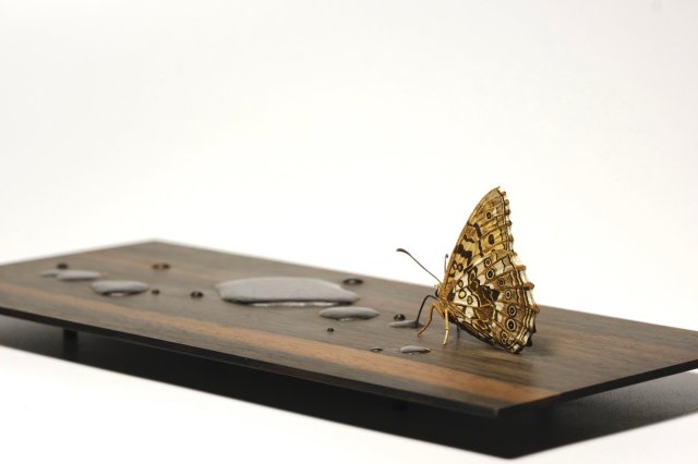 Butterflies can sometimes be found sipping moisture from puddles or wet soil after a rain. The process, seen here in the image above, is known as “puddling.” Except this image is not a real-life butterfly, nor are the puddles made from real water. The scene has been sculpted entirely from wood by Japanese artist Toru Fukuda.