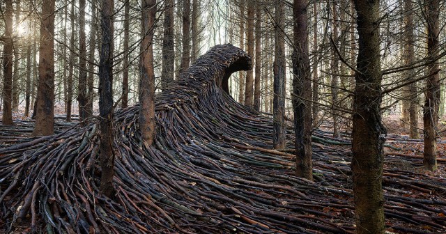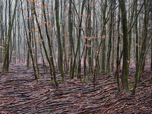 Between November 2020 and March 2021, Gläscher spent his days in a secluded location near Hamburg, where he gathered deadwood and constructed nine massive crests—the largest of which spans four meters high and nine meters wide—that overwhelm the forest floor in undulating layers of branches and twigs. Each iteration, which he photographed and then promptly destroyed in order to reuse the materials, overwhelms the existing landscape with pools of the formerly thriving matter.[…]