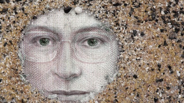 Although the sand shown is small in quantity—Parks can hold all of it in her two hands—it’s sourced from more than 50 countries just like the paper currency, and both materials converge in a perpetual juxtaposition of culture, economics, and nature. The rocks flow across the screen like water and animals, while the colorful collages of ripped money contrast distinct national figures and heritage against a universal economic backdrop.[…]