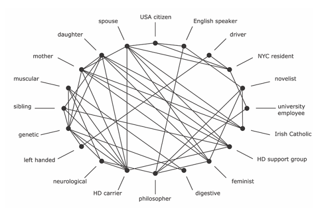 Let’s take a concrete example. Consider Lindsey: she is spouse, mother, novelist, English speaker, Irish Catholic, feminist, professor of philosophy, automobile driver, psychobiological organism, introverted, fearful of heights, left-handed, carrier of Huntington’s disease (HD), resident of New York City. This is not an exhaustive set, just a selection of traits or identities. Traits are related to one another to form a network of traits. Lindsey is an inclusive network, a plurality of traits related to one another. The overall character – the integrity – of a self is constituted by the unique interrelatedness of its particular relational traits, psychobiological, social, political, cultural, linguistic and physical.