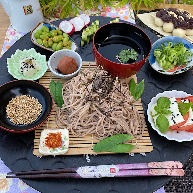 This is the time in Japan of hot humid rainy days, a time when people might not feel like preparing food so cooling food that’s easy to prepare would be eaten. Things like watery fruits and vegetables cucumber and tomato to be eaten simply with cold noodles and a chilled broth. You could try zaru soba, cold soba noodles with a chilled dipping sauce. The name zaru refers to the sieve or strainer the cold noodles sit on. Often served with condiments like grated daikon, chopped green onion and sesame.