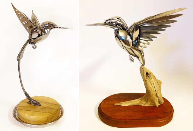 Wide spoons become muscular hind legs, pointed handles fan out into wings, and fork prongs curl around a branch like talons in Matt Wilson’s wildlife assemblages. Using found flatware and other metal objects, the Charleston-based artist (previously) welds sculptural renditions of birds, insects, and other small animals that appear lifelike and primed for movementt. He mounts the metallic sculptures on pieces of driftwood or smooth plaques—many of which are handcrafted by his friend Jacob Kent—that contrast the shining metal with the natural, grainy material. […]