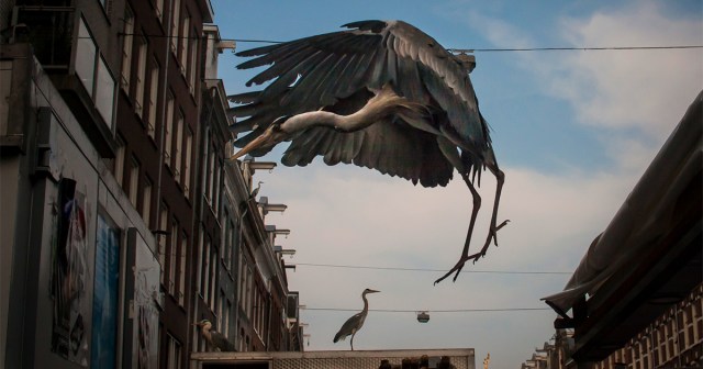 Spending timing in any major city is likely to bring run-ins with urban wildlife like rodents and pigeons, but in Amsterdam, there’s one long-legged species stalking the streets in unusually large numbers. In her ongoing series Herons of Amsterdam, photographer Julie Hrudová documents the thriving feathered population—it’s grown considerably in recent decades, and in 2017, officials estimated there were 800 pairs living in 25 neighborhoods—swooping down to sidewalks for a meal and confidently strutting into people’s homes.