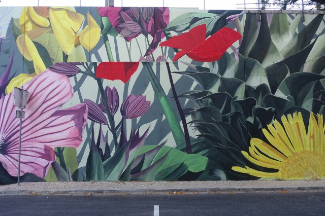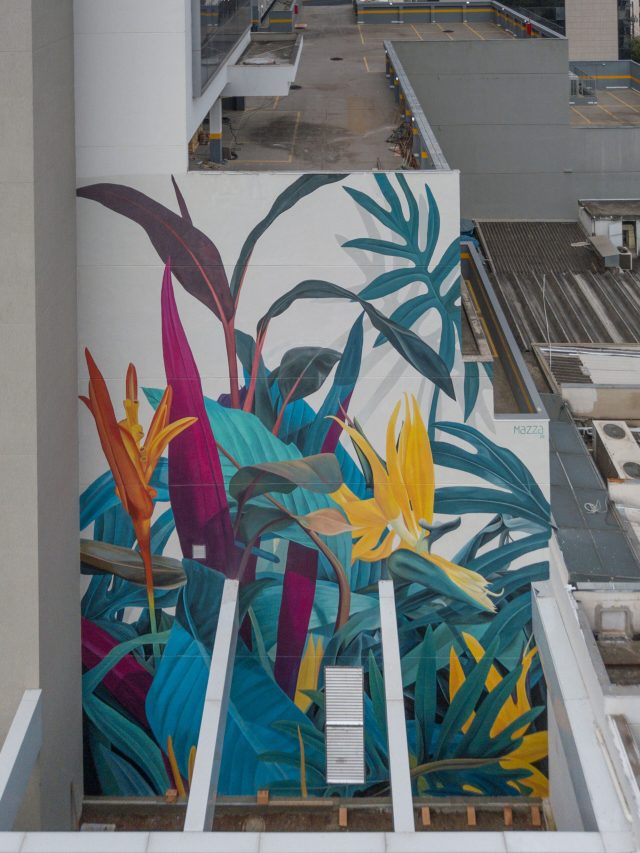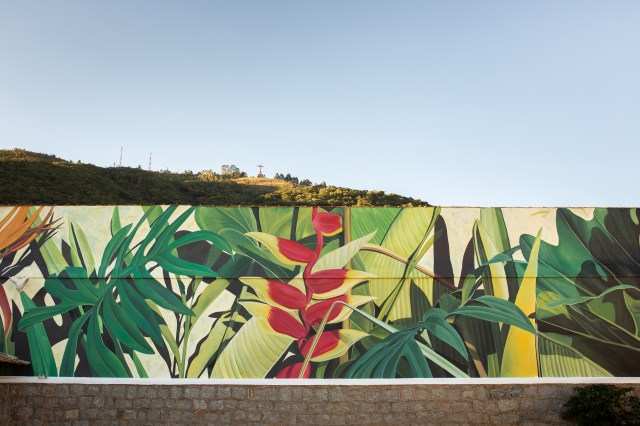 In his brilliantly hued murals, Brazilian artist Thiago Mazza recreates the dense foliage and thick, fleshy petals he encounters in tropical forests and other verdant areas. Prickly thistles, striped leaves, and seemingly endless varieties of flowers spring up in wild masses that crawl down sidewalks and engulf entire buildings.