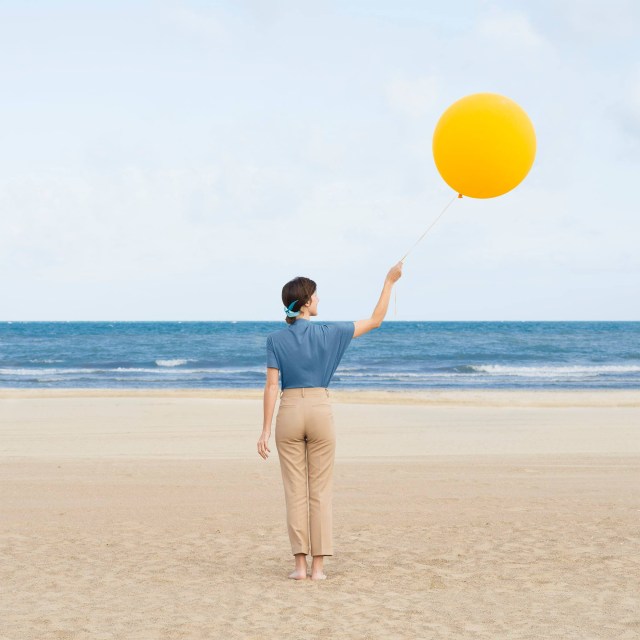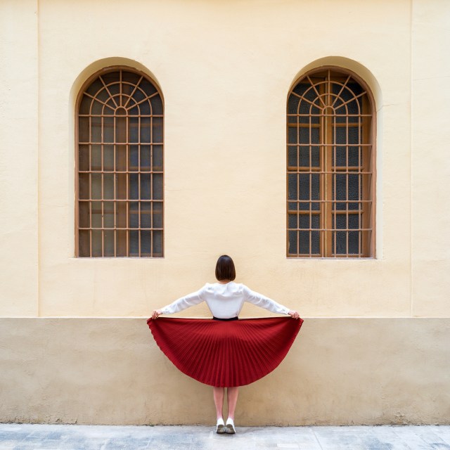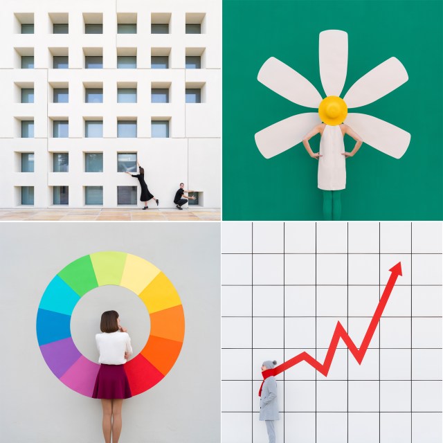 Valencia-based duo Anna Devís and Daniel Rueda (previously) add a playful twist to mundane settings and architectural backdrops. Whether flaring a skirt into a wide, cheesy grin, posing to prop up a facade’s stripes, or gripping the tail of a balloon that looks like a tethered sun, their minimal compositions turn geometric elements and open spaces into theatrical sets ripe with humor and joy.