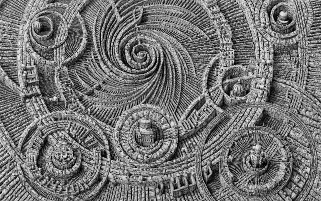 Using only a pen on paper, Sack captures fantastical metropolises that are entire worlds in and of themselves. Some of these drawn cities, like Leitmotif, are contained by an invisible, circular wall. This negative space both limits the size of the cityscape and enhances the overwhelming complexity which exists within the borders—in which buildings and bridges eternally ripple through the streets.