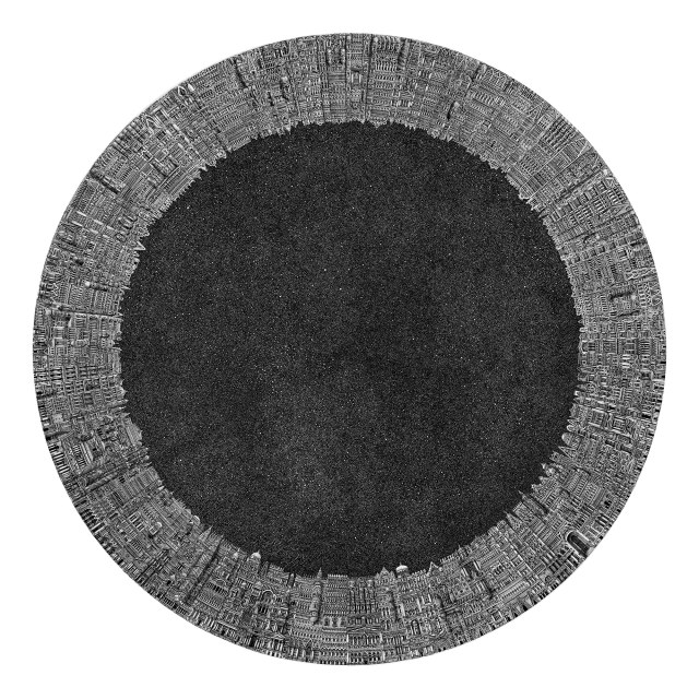 Other cities by Sack appear to be situated on the cusp of outer space. In BOXED-In (An Ode to Asteron), the urban planning extends beyond the horizon, creating a window into a dark and speckled sky. Similarly, Icon II depicts a ring of impressive classical buildings that are placed against the same shifting black and white backdrop of the universe.[…]