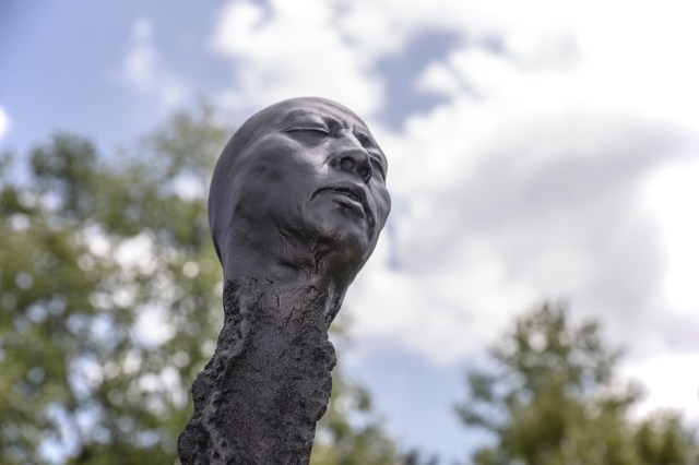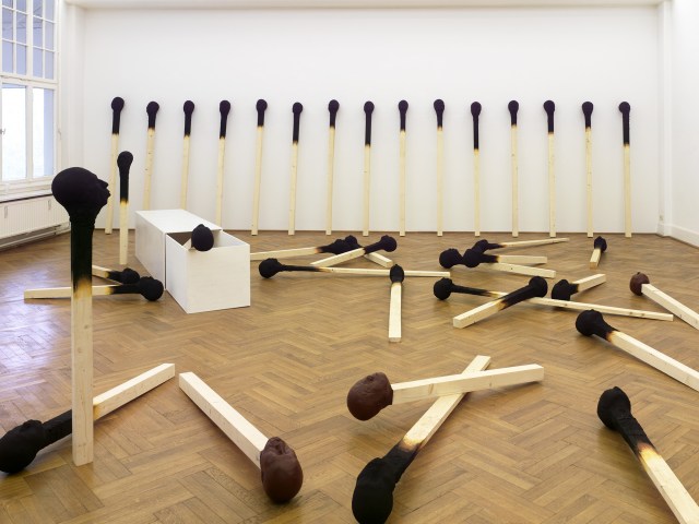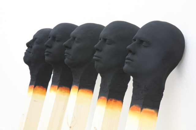 Often propped up in a row or symbolically arranged, the ongoing series of charred matches by Wolfgang Stiller are oversized and surreal renditions of the book-bound lookalikes. The German artist sculpts human heads in bright red or gradient-lined black signaling previous use that sit atop the square posts standing about five feet tall. Aptly titled Matchstickmen, the nondescript figures span the gamut of human emotion, ranging from pained expressions and distress to joy and calm.
