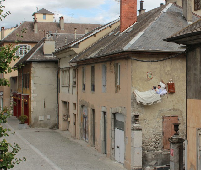 Multidisciplinary artist Thierry Mandon casts himself as the subject of his satirical works as he reads in a bed hazardously suspended feet above the ground or sips a glass of wine at a halved dining table. The humorous and discomforting pieces, titled “Inside–Outside” and “Tableau vivant,” respectively, unveil a series of slow, solitary activities that, once outdoors, become a performative spectacle rather than a mundane moment. They speak to Mandon’s “search for harmony and for a stable unity between humans and their environment,” he says, as he literally slices and adheres domestic objects to a building’s facade.