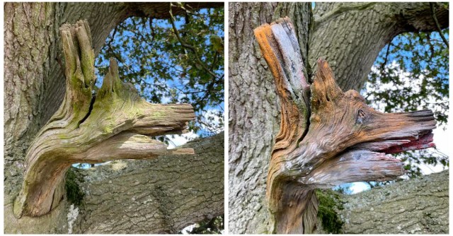 Syd: I planned to paint this as a wolf. Bizarrely when I made my way through the woods to get to this tree I sprung a fox, he had obviously seen and heard me a mile off but I accidentally trundled into his path. Maybe it remained in my subconscious as the wolf spray paint colouring went from grey to brown and began to evolve. Thankfully I had a can of light orange in my bag so was able to skim in those distinctive tones. Creating something quite unexpected.