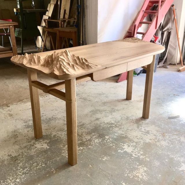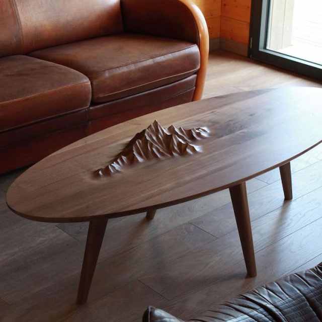 In a bid to bring the beauty of nature indoors, furniture designers Benoit Vauthier and Manu Lerendu create one-of-a-kind tables that pay homage to the breathtaking landscapes of America and Europe. Using traditional sculpting tools, they transform wooden surfaces into sculptural, relief table tops that look like little mountain ranges.