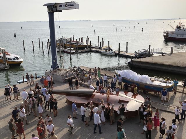The violin is nearly 40 feet long and 13 feet wide and is inspired by one of de Marchi’s paintings. The artist worked with other local artisans, artists, and technicians to bring his vision to life. In the end, the group created a magnificent floating instrument that was able to support the weight of the performers who played music during a city-wide sailing parade.